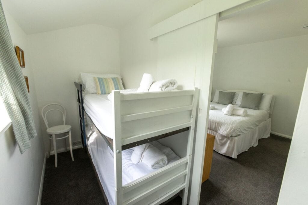Downstairs in the cottage, there is an open plan lounge with a TV, a dining area in the conservatory area, plus a separate kitchen. Upstairs there is one double bedroom and this is accessed via an inter-communicating sliding door in the double bedroom, there is a further small room with child bunk beds.